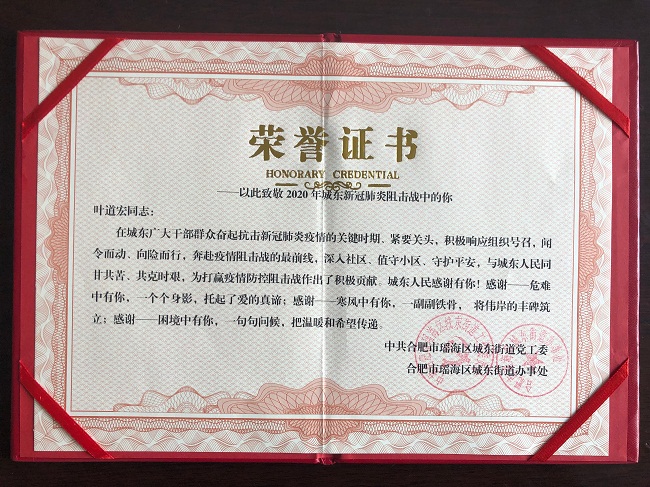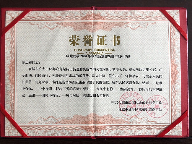 4月26日,中共合肥市瑤海區(qū)城東街道黨工委、合肥市瑤海區(qū)城東街道辦事處對(duì)葉道宏、滕忠和兩名同志在新冠肺炎疫情防控中的突出表現(xiàn)予以表?yè)P(yáng),并發(fā)放榮譽(yù)證書,證書中寫道:“城東人民感謝有你!感謝—危難中有你,一個(gè)個(gè)身影,托起了愛(ài)的真諦;感謝—寒風(fēng)中有你,一幅幅鐵骨,將偉岸的豐碑筑立;感謝—困境中有你,一句句問(wèn)候,把溫暖和希望傳遞”。深情的感謝,承載了城東人民無(wú)限的心聲,眾志成城抗疫情,萬(wàn)眾一心戰(zhàn)病魔。同時(shí),希望廣大黨員干部、職工積極向他們學(xué)習(xí),繼續(xù)發(fā)揚(yáng)大公無(wú)私、樂(lè)于奉獻(xiàn)的精神。